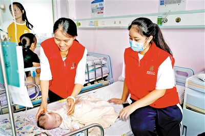 志愿者在龙华区中心医院住院部照顾患者。