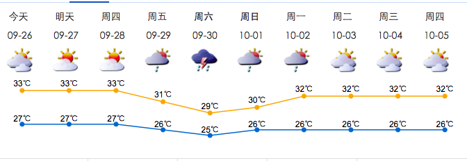 我市多云间晴天,局地有短时阵雨;气温27-33℃;南风2-3级;相对湿度60%-95%