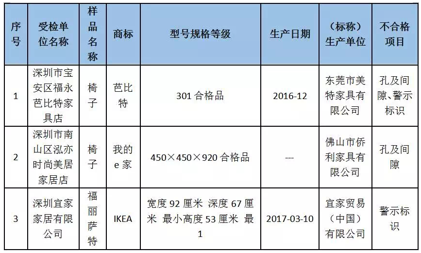 记者26日从深圳市市场和质量监管委获悉,2017年儿童家具产品质量监督抽查结果日前公布,本次监督抽查对象为深圳市生产和流通领域的14家受检单位20批次产品,经检验,合格产品17批次,不合格产品3批次。不合格项目有:孔及间隙、警示标识。其中,标称宜家贸易(中国)有限公司生产的“IKEA”福丽萨特儿童家具产品警示标识项目不合格。