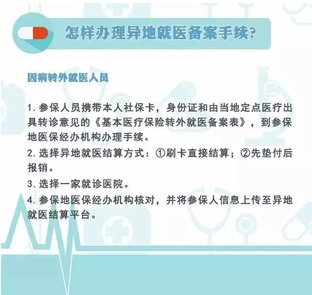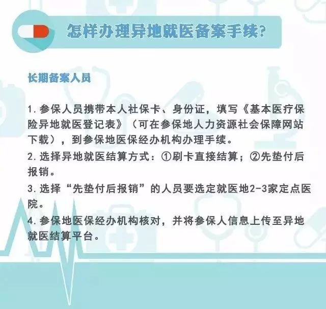 跨省异地就医前,应按参保地相关规定到当地社会保险经办机构进行登记备案,经办机构将备案信息上传至国家基本医疗保险异地就医结算系统后,在开通的定点医疗机构就医时,可以持社会保障卡直接结算住院医疗费用。