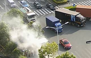 龙岗货车车头起火 司机一脸懵样全然不知