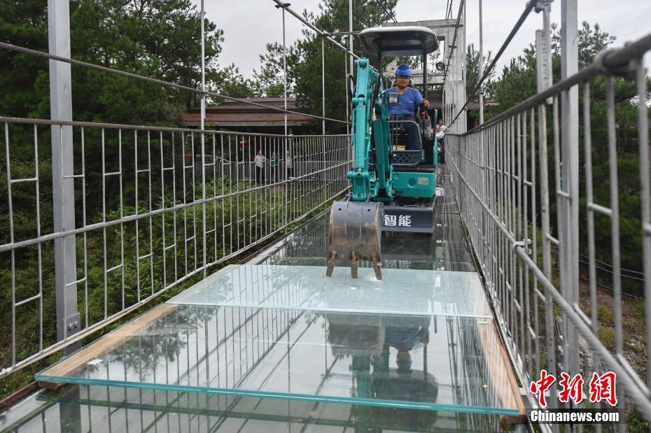9月29日,一辆重达3吨的小型挖掘机开上湖南平江石牛寨高空玻璃桥,并在桥面进行撞击玻璃等承重抗压测试,以此方式展现玻璃桥的高强度承载能力。