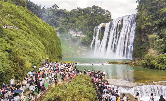 ▲游客在贵州省安顺市黄果树瀑布景区游览(10月2日摄)。新华社 发