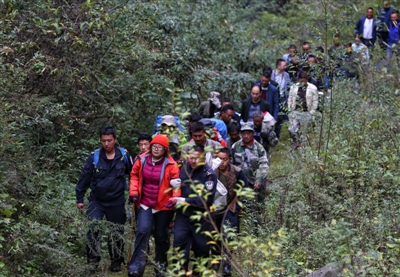 救援人员进山搜寻。下午5时,救援队到达范家牛棚,休整一晚。