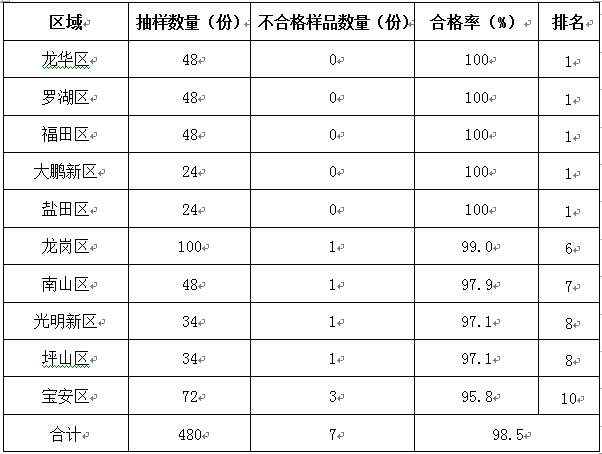 10个区(新区)食用农产品总体的合格率如何?龙华区、罗湖区、福田区、大鹏新区、盐田区5区合格率 100%;宝安区合格率最低为95.8%。