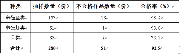 8月抽检的水产品是:养殖鱼、养殖虾和贝类共280份,其中合格率最高的是养殖虾98%,合格率最低的是贝类 78.1%。但相比于上月,贝类合格率提升了18个百分点。