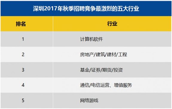智联招聘2017年秋季在线数据显示,深圳地区竞争指数排名前五位的行业中,计算机软件行业的竞争指数最高,其次是房地产/建筑/建材/工程行业,基金/证券/期货/投资行业排在第三。
