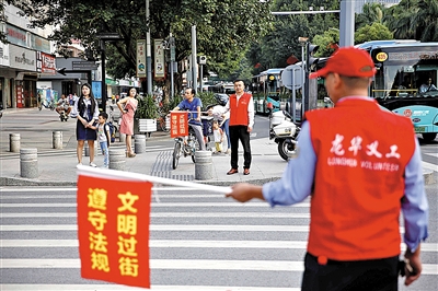 昨日,龙华义工在龙华人民路与三联路交会路口进行交通文明劝导。