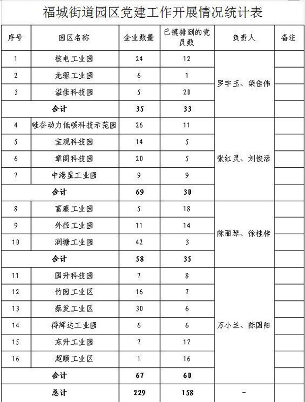 经过一个星期的实地走访、深入摸排,各组工作取得了一定的进展,得到了大多数企业管理层及员工的支持,共排查出党员158名,具体明细如下: