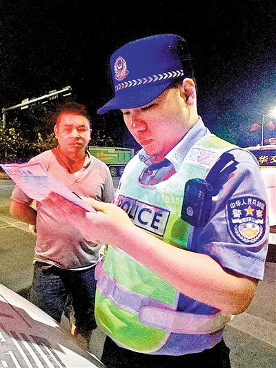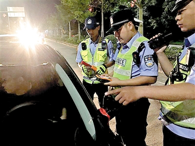 郑艺在“猎虎”行动中给司机测酒精含量。