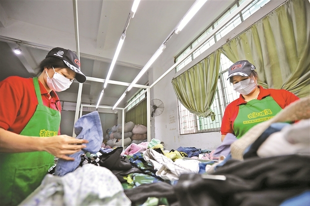 衣旧情深的工人们正将回收来的衣物分拣打包。