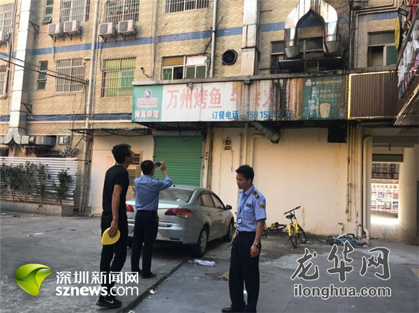 执法队员对富士康北门周边餐饮店铺乱排污水、油烟排放污染外立面等现象进行排查。