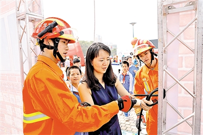 在4米高处体验楼宇高空逃生技能,在“三小”场所模拟区查找安全隐患,在浓烟滚滚的“火灾”现场模拟逃生……11月10日,龙华区“119消防宣传日”启动仪式暨消防安全技能大比武活动在观湖街道世纪广场举行。十一项消防体验活动让辖区居民玩得尽兴,学得充实,做游戏的同时增强了在紧急情况下的应变能力、逃生能力和自我防护能力。副区长、区消安委主任、龙华公安分局局长井亦军参加活动。