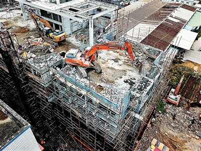 本报讯(龙华新闻记者 宋彪 通讯员 曾小舟/文 记者 蔡维泽/图)在东莞塘厦镇和深圳龙华区观澜街道办交界的一处违建,因多种原因一直没有拆除。昨天,深莞两地执法部门采取联合行动坚决将其拆除。据悉,这是深圳近年来首次开展市级跨区域联合执法行动拆除违法建筑。
