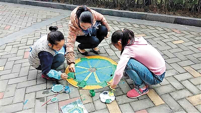 孩子们快乐地在井盖上涂鸦。龙华新闻记者 蔡维泽 摄