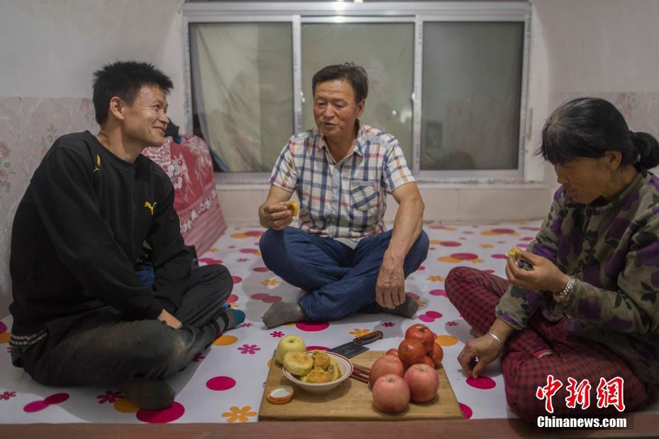 图为高政清一家三口在家中的炕上聊天。