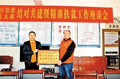 今年福城将基层党建工作与精准扶贫工作深入对接融合,以党建引领扶贫、以扶贫助力党建。图为紫金县蓝塘镇双兴村党委杜书记向福城街道茜坑社区党委书记张国帆赠送感谢牌匾。
