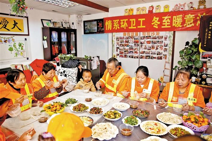 环卫工人围成一桌,共吃一顿温馨的冬至宴。