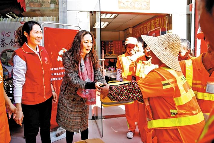 到了中午,可可沙龙党群服务V站已经摆好“长桌宴”,热乎乎的饺子出炉,还精心准备有汤圆、各式配菜、水果。辖区环卫工人里不少人老家在四川,有义工还特别送来了四川腊肠、腊肉。“我一天至少来这里5次,歇歇脚,喝喝茶。”一位环卫工人高兴地向记者说道,社区里有这么关爱环卫工人的组织,大家都觉得很开心。环卫工人边吃边聊,享受着难得的放松时刻。“最近天气冷,打扫起来是吃力了些,但我们不觉得累,这是应该做好的。”年过6旬的杜清华和老伴都在景龙社区当环卫工人,她指着脚上的棉袜子,笑着说,这是“可可沙龙”之前派发的。“长桌宴”结束后,来到现场的龙华百合爱心志愿者协会还给环卫工人派发药包,里边装有正骨水、跌打酒、藿香正气丸等家庭常用药。
