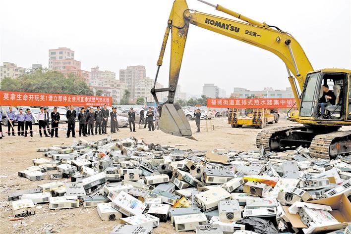 本报讯(龙华新闻记者 黄晓华 通讯员 谢红梅 邓建朋/文 记者 陈建华/图)随着一阵阵机器的轰鸣声,一台台直排式热水器瞬间被碾压成废铁。1月23日下午,福城街道对近期在专项行动中排查出的657台直排式热水器进行集中销毁。