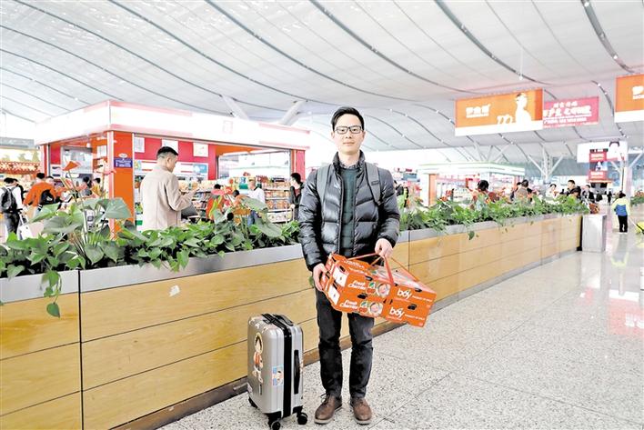湖南小伙胡治国在深圳打拼四年了,他提着两箱沉甸甸的樱桃踏上归家路。一箱给家人,一箱给朋友,胡治国笑着说,去年工作变动,没攒下什么钱,过年没法给爸妈包大红包了。“已经提前‘通知’了老爸老妈,等过完年再努力赚钱。”胡治国幽默地说。