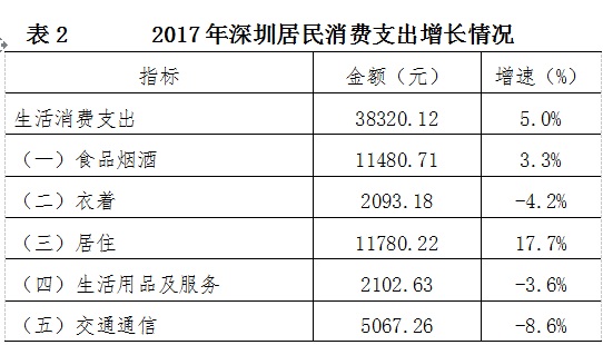 国家统计局深圳调查队2月6日发布最新统计数据,据深圳居民收支与生活状况调查(一体化住户调查)数据显示,2017年深圳居民人均可支配收入52938.00元,比上年名义增长8.7%,扣除价格因素实际增长7.2%,名义增幅比上年回落0.4个百分点,实际增幅比上年提高0.7个百分点;人均消费支出38320.12元,同比增长5.0%,扣除价格因素实际增长3.6%,名义增幅和实际增幅分别比上年回落7.7和6.5个百分点。