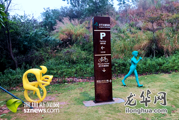 日前,记者来到位于福城街道龙观快速的环城绿道大水坑段,这里也是绿道的主入口。据了解,该路段主要有龙舞华章、乡野花海、粉草芭蕉、荷香小憩、杜鹃花坡、百草童趣、星空绿道、麦田农家、湿地花园、果场渔乐、龙眼客栈、云隐之森等十二大景点。走近绿道首先映入眼帘的便是以草书撰写的“龙舞华章”Logo,看起来就像是一个正在骑行的人,这正是龙华绿道的标志。