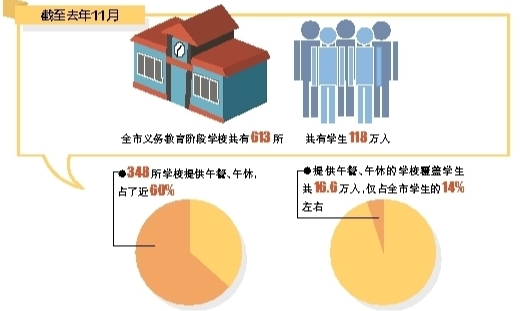 据市教育局学校安全管理处介绍,截至去年11月,全市义务教育阶段学校共有613所,学生共有118万人。其中,348所学校提供午餐、午休,占了近60%。但这六成有午餐、午休的学校,所覆盖的学生共16.6万人,仅占全市学生的14%左右。