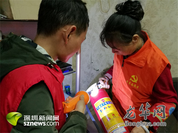 党员志愿者对社区商铺的消防器材进行排查。