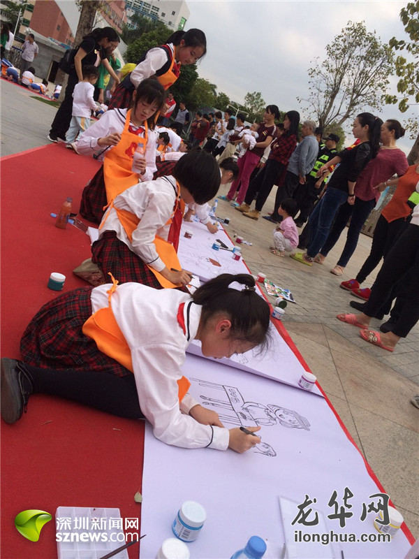 伴着现场活跃的气氛,主题绘画活动拉开序幕。百名青少年学生拿起手中的画笔,在百米长卷上尽情挥洒,每个同学都积极参与,发挥自己的想象,创作精彩的作品。绘画现场吸引了众多居民驻足观赏和家长的现场教学。小画家们有的蹲、有的跪、有的趴在画布上,他们认真仔细地绘画,用自己纯朴的童心和稚嫩的小手,在百米画卷上尽情挥洒自己的创意。
