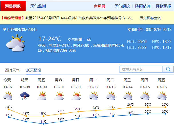 市气象局预计,另一股较强冷空气将于3月7日夜间抵达深圳,受冷空气和切变线的共同影响,深圳将出现雷阵雨天气,局地可达大雨,主要降雨时段出现在3月7日下半夜至3月8日中午;3月8日凌晨到夜间沿海和高地将出现7-8级阵风;天气显著转凉,3月8日傍晚气温降至13℃左右;3月9日转晴朗干燥,风力减弱,最低气温10-11℃;10日起气温开始回升。