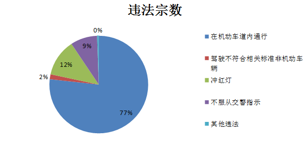 行人非机动车违反规定在机动车道内行驶通行 47045宗驾驶不符合相关标准的非机动车上道路行驶 988宗行人非机动车不按照交通信号规定通行 7514宗行人非机动车不服从交警指挥 5409宗其他行人非机动车违法 341宗经统计,在本周整治行动中,行人非机动车违反规定在机动车道内行驶通行违法行为占比普遍较高,占本周违法总量77%。