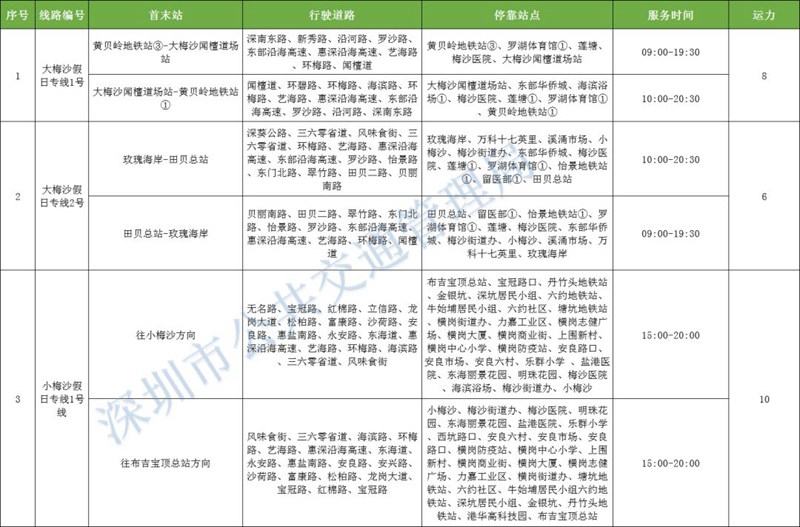 4月5日至4月7日期间,巴士集团将抽调14台运力开行大梅沙假日专线1号(大梅沙-黄贝岭地铁接驳站)、大梅沙假日专线2号(玫瑰海岸-田贝总站);东部公交将抽调10台运力开行小梅沙假日专线1号(小梅沙-布吉宝顶总站)。