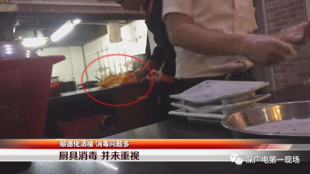 消毒是餐饮最起码的安全防线。暗访记者却发现,在这家酒楼里,消毒只是口头上的话题,实际上并未重视。老员工将切完糕点的菜刀,拿一块脏的桌布擦完后就放入桌底备用。