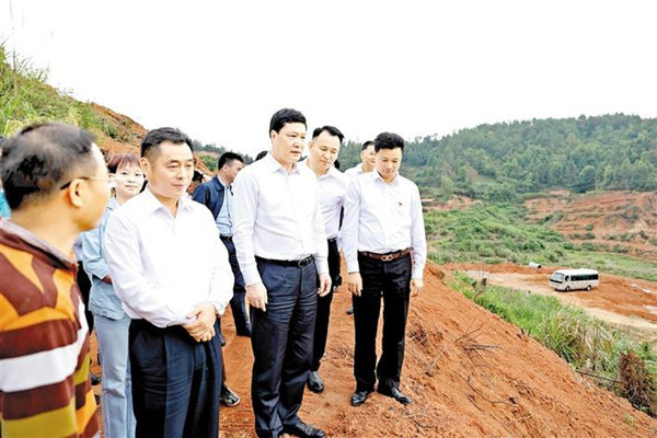 4月20日下午,区委书记余新国(前排左三)等领导调研紫金县腊石村精准扶贫项目三红蜜柚基地。