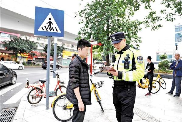 龙华交警在街头开展交通文明整治,对行人闯红灯、非机动车走机动车道等行为进行处罚。龙华新闻记者 蔡维泽 摄