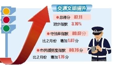 调查结果显示,龙华区交通文明环境守法率指数有所提高。守法率指数为89.57分,比2月份增加1.87分,主要因为相关测评路口均有交通管理人员,且积极维护交通秩序,行人闯红灯等违法现象减少;市民感受度指数呈上升趋势。市民感受度指数为80.75分,比2月份增加1.75分,接近“比较满意”,相关测评路口过往市民对交通文明满意度评价有所上涨;但存在路口交通标识、标线缺失情况增加,人行道无障碍指数排名较低,相关测评路口非机动车乱停放现象增加等不足,需要进一步提升。