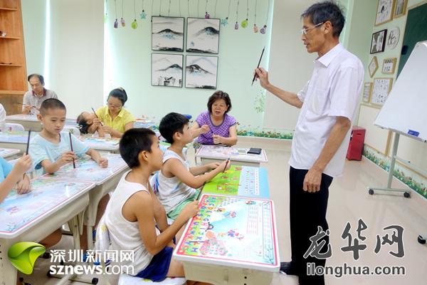 观湖街道鹭湖社区“五老”骨干指导社区学生练习毛笔字。