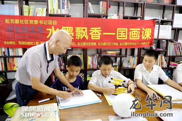 观湖松元厦老艺术家陈炳林指导社区小朋友画国画。