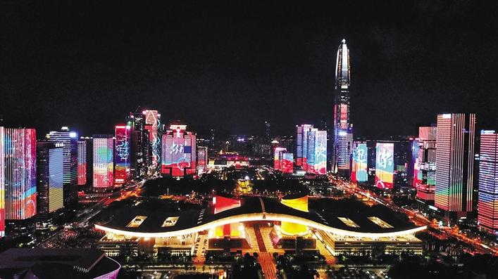 近日,深圳福田中心区的灯光秀打出了“深圳欢迎你”字样。深圳商报记者 肖兵峰 摄
