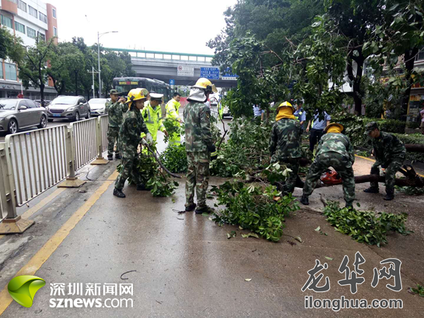 交通协管员协助清理观澜大道上的树木,恢复道路干净顺畅。
