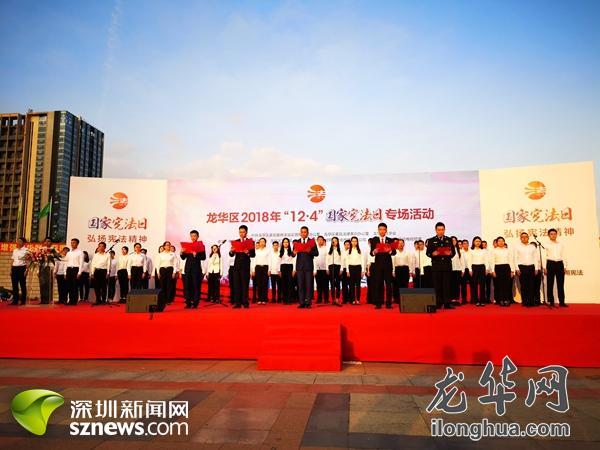 深圳新闻网12月3日讯 (记者 陶倩 通讯员 李丹丹)为深入贯彻落实习近平总书记全面依法治国新理念新思想新战略和中央关于深入学习宣传和贯彻实施宪法的部署,推动宪法宣传教育形成热潮,12月3日,龙华区在龙华文化广场举办龙华区2018年“12·4”国家宪法日暨全国法制宣传日专场活动。活动首次组织全区普法各成员单位近百名公职人员代表上台誓师,以表宣传和维护宪法的决心。深圳市司法局副巡视员吴振东,龙华区委副书记、政法委书记苗宁礼出席活动,全区41家普法成员单位参加活动。