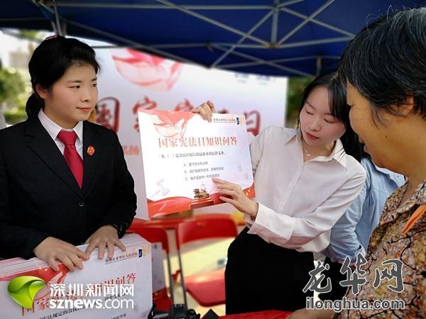 活动现场,深圳大学法学院尤乐博士结合由龙华区委政法委、司法局原创制作的五个宪法宣传视频,围绕“宪法是个啥”、“为啥要制定宪法”、“宪法的核心是啥”、“宪法与生活有啥关系”、“现实生活中咋维护宪法”等主题深入浅出地向辖区居民介绍宪法的内涵、核心及遵守我国新时代宪法的意义。由区教育局精心编排选送的学生“宪法民谣”快板朗诵,强调宪法宣传在学生这个重点群体中的重要性。活动现场还访谈了宪法山歌创作者谢丁福老党员,了解歌曲的创作思路,感受他创作的初心即以音乐的形式向大家传播宪法精神。最后,区委政法委、法院、检察院、龙华公安分局、司法局公务员代表引领各普法成员单位近百名公职人员代表为宪法誓师,以庄严姿态,表达尊崇宪法、学习宪法、遵守宪法、维护宪法、运用宪法的决心。