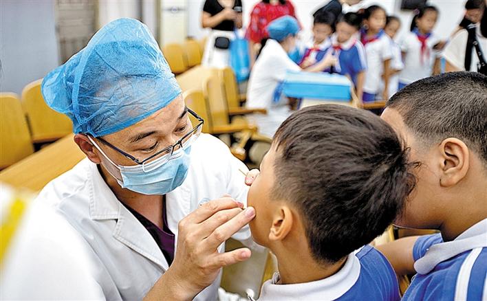龙华区慢病中心牙医进学校为小学生检查口腔健康。