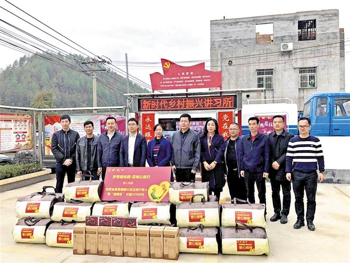 本报讯(龙华新闻记者 吴春华 通讯员 刘永文 文/图)刚迎来2019年的紫金县黄塘镇,寒冬将至。1月16日,观澜街道办携手碧桂园集团在紫金县黄塘镇组织开展“冬日暖阳,关爱长者,助力脱贫攻坚”捐赠活动,“碧桂园”向黄塘镇65名孤寡老人送上温暖包,包括棉被、暖水壶、收音机等物品,总价值33500元。观澜街道党工委委员黄燕、碧桂园深圳区域副总裁丁磊、党支部书记崔梅以及黄塘镇干部群众参加了捐赠仪式。这次活动旨在帮助贫困村孤寡老人天冷不挨冻、外出不口渴、生活不孤单,暖心之举得到紫金县各界的点赞。