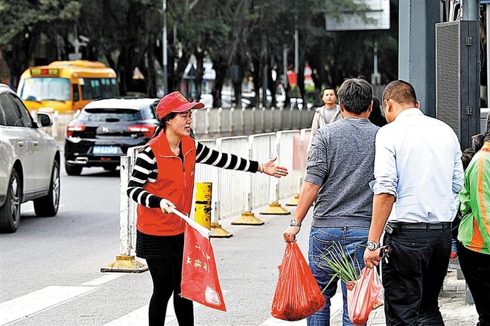 李珍梅在路口开展交通文明劝导服务。