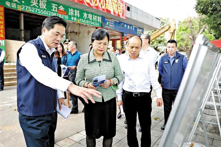 昨日上午,区委书记杜玲(前排中)等领导在龙华街道景龙社区拆违现场了解拆违情况。