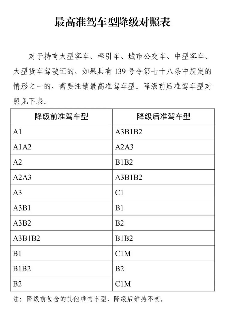 另外2016年1月29日颁布的公安部令第139号规定,被降级的驾驶人应当接到通知后30日内办理注销降级换证手续,逾期未办理者,其最高准驾车型驾驶资格将被公告作废。并非网传的“自动降级”。
