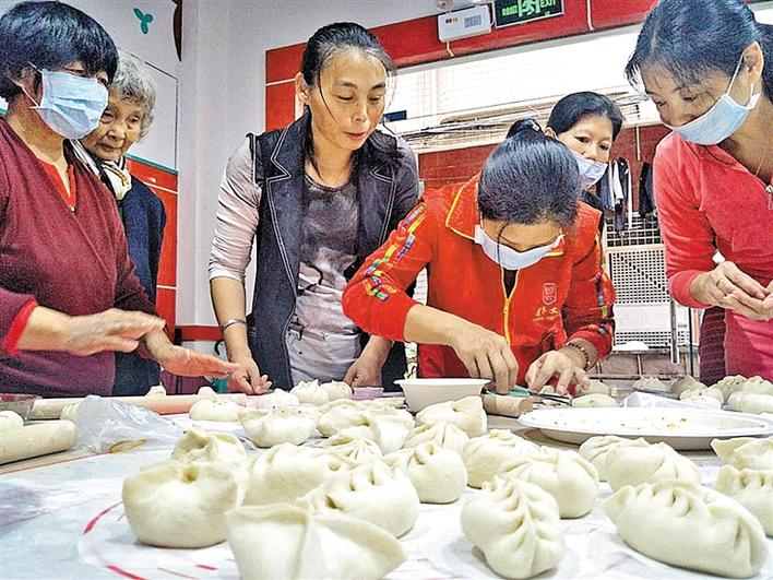 义工吴远芳毛遂自荐,把自学掌握的多种美食制作技巧分享给居民。在她的细心指导下,从和面、发面、调馅等基本方法到面团二次醒面、包子成型后要用冷水上蒸等“独家秘笈”,义工们都能以认真的态度学习并掌握,在大家共同努力下,一只只憨态可掬、形态各异的面点呈现出来,“小猪佩奇”、“抱团取暖小刺猬”、“太空螃蟹”、“粉红玫瑰”等作品在巾帼义工的手中活灵活现。义工们将自己亲手制作的面点与小区里辛苦工作的保洁阿姨和保安分享,为他人带去了欢乐,也丰富了自己的生活。