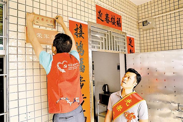 福城街道工作人员上门为退役军人家庭悬挂光荣牌。